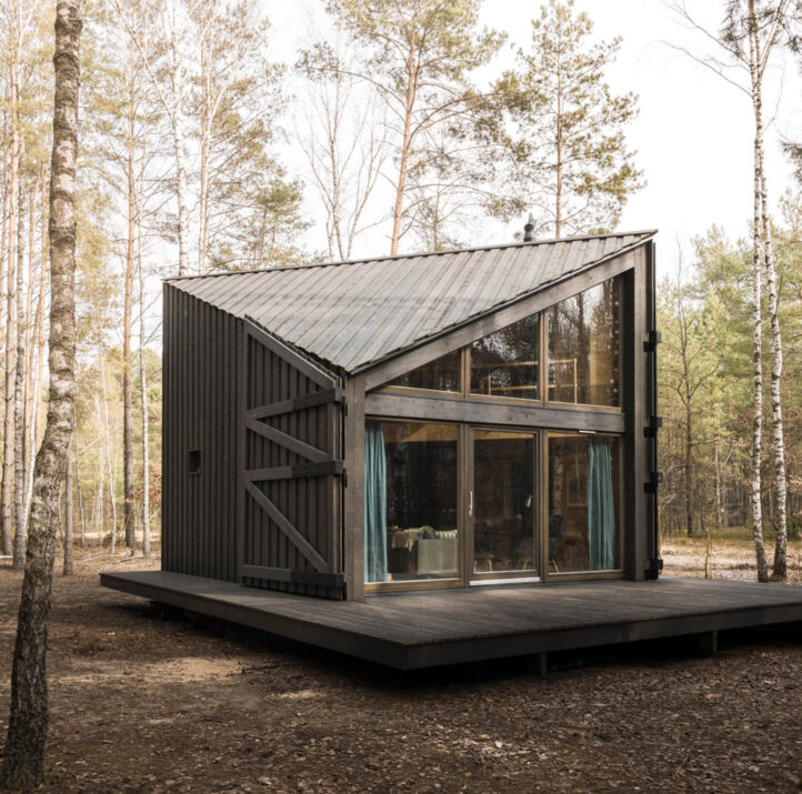 Kameralny domek pośród gęstego lasu pod Wyszkowem. Zrealizowany w Podgaci na malowniczej, zalesionej działce, gdzie architektura naturalnie wpisuje się w otoczenie. Powiększony taras i wyraźne nadwieszenia nadają bryle lekkości, sprawiając wrażenie, jakby unosiła się nad ziemią.