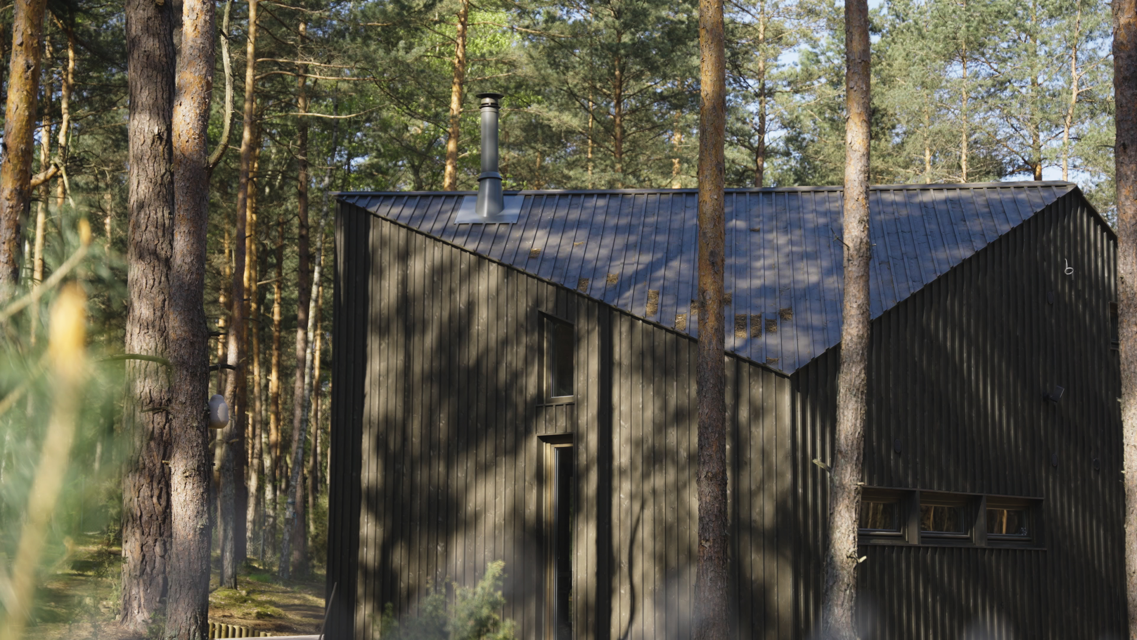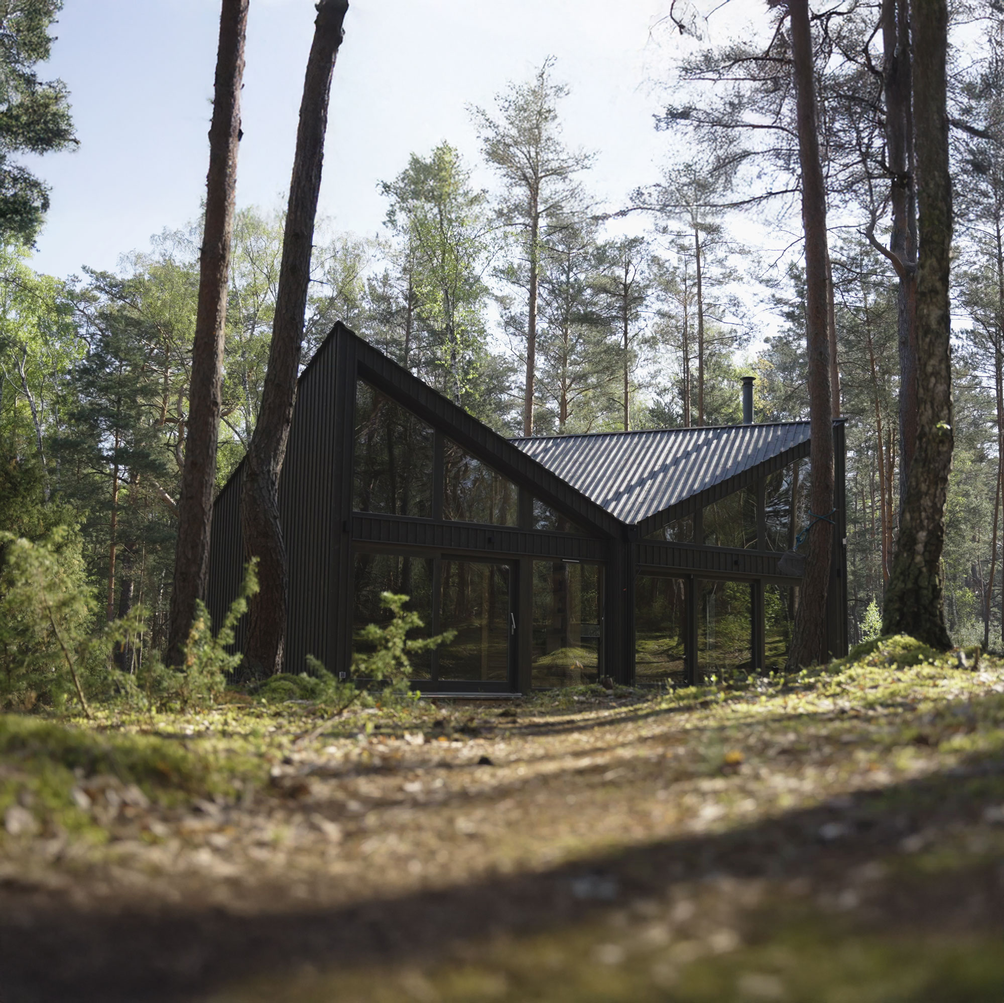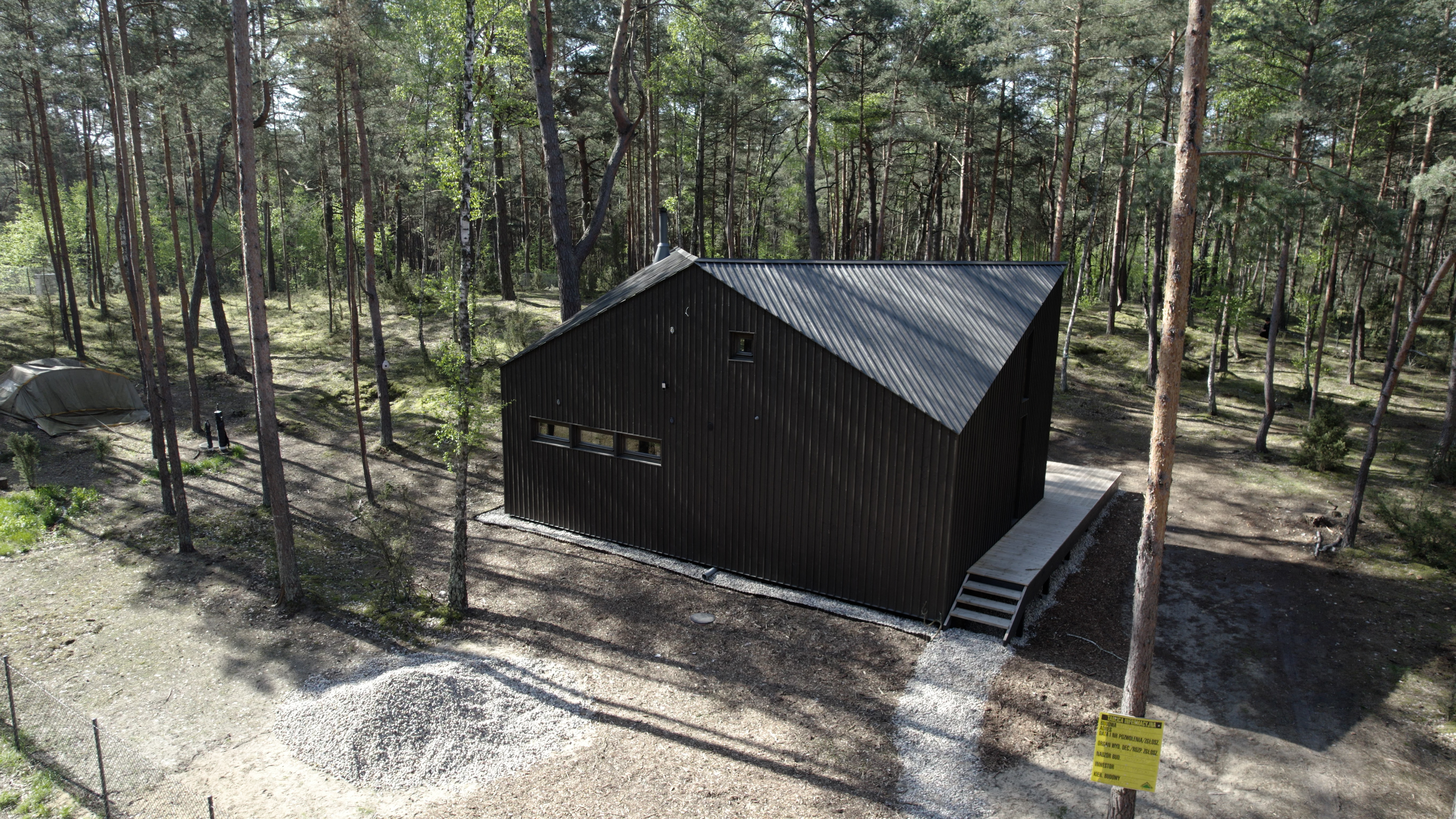 W podwójny DBJ I 70 stanął w lesie w Popowie na malowniczej działce. zalesiona działka stała się idealnym miejscem na nowe siedlisko. Dzięki większemu tarasowi, przestrzeń funkcjonalna domu wzbogaciła się, a przez duże nadwieszenia, domek jakby lekko unosił się nad ziemią, dodając bryle lekkości.